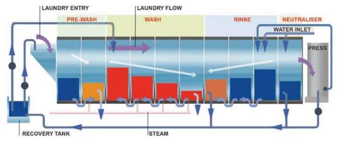 - Washing tunnels: accommodate approximately 50kg of laundry per module