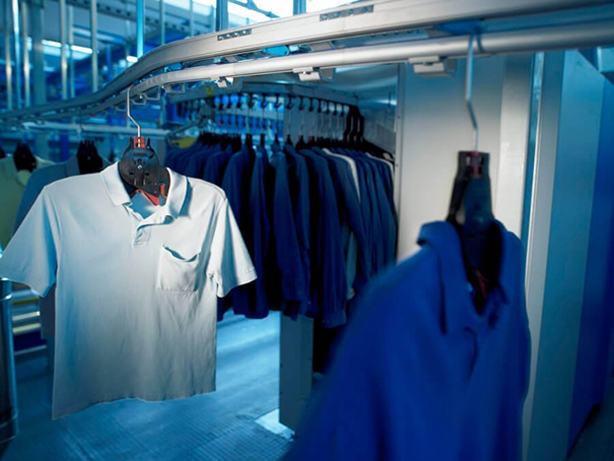 Clothes are transported to the staff who place each garment on a hanger